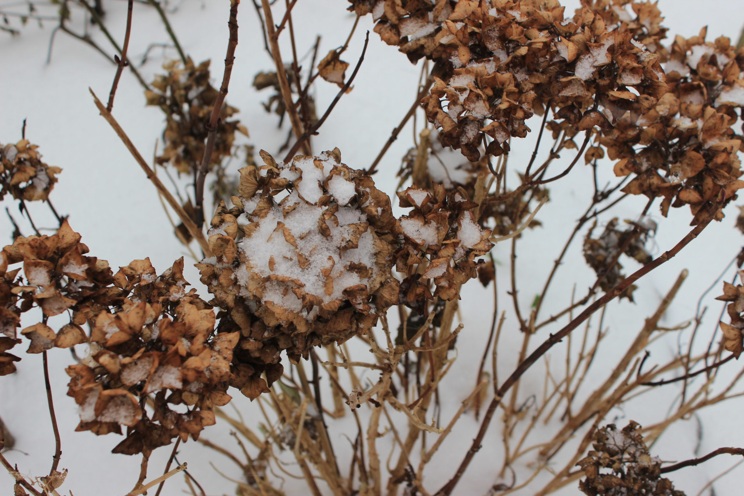 Schnee ist hübsch, macht unsere Wintertage heller und schützt die Pflanzen und den Boden vor zu starker Frosteinwirkung. Tagelang waren alle Erdbeeren im Topf, das Laub im Hochbeet und sogar hier die Blütenstände der Rispenhortensien mit weißen Häubchen bedeckt.